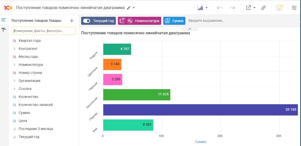 - Действия командной панели с выделенными ячейками диаграммы (фиксация строк, колонок, автосумма, фильтр по выделенному и кроме, открытие в 1С по ссылке)